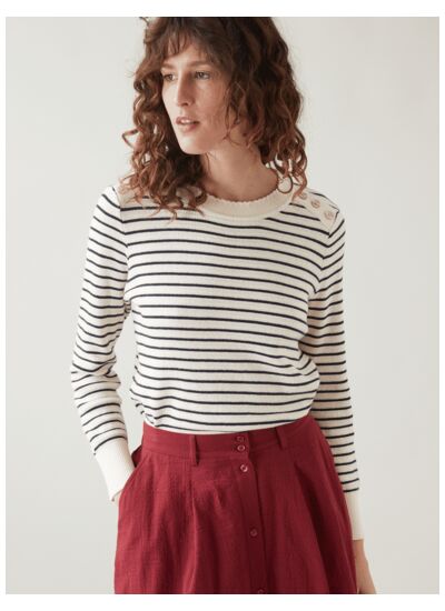 Confectionné dans une maille fine et résistante, ce pull allie confort et raffinement. Sa coupe légèrement ajustée souligne la silhouette sans contraindre, tandis que ses finitions soignées rappellent l’authenticité du vêtement marin revisité. Porté seul ou superposé, il apporte une note lumineuse et délicate à vos tenues.
