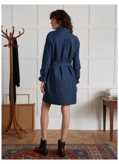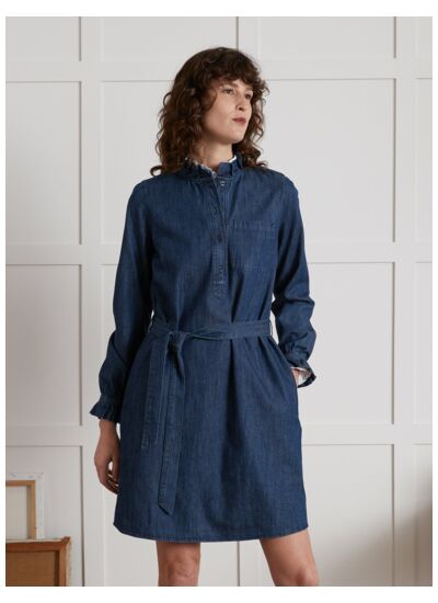 100% coton chambray, entretien facile en machine, coupe droite avec volants sur le bas et les manches, longueur midi, disponible en plusieurs tailles.