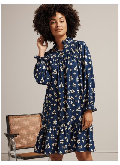 Robe en tissu dobby léger, coupe évasée, longueur genou, manches courtes, col rond. Disponible en plusieurs tailles. Entretien facile, lavage en machine recommandé.