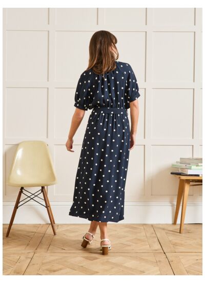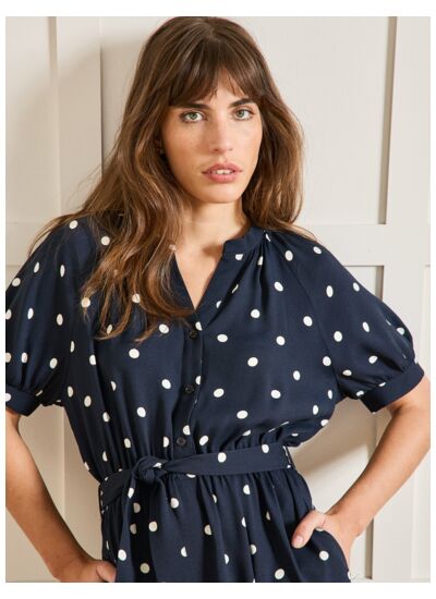Robe en crêpe légère, imprimée pois. Coupe fluide, longueur midi. Manches courtes. Fermeture par zip invisible au dos. Disponible en plusieurs tailles.