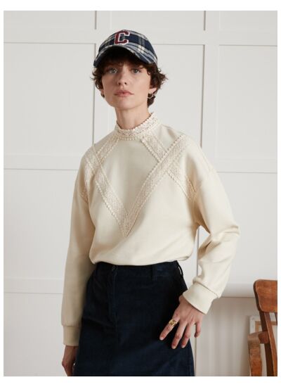 Fabriqué en coton majoritaire, ce sweat présente une finition en dentelle sur le devant. Coupe ajustée, manches longues, col rond. Lavage en machine recommandé pour préserver la qualité des matières.