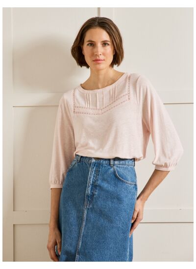 Ce t-shirt est réalisé en lin, matière naturelle reconnue pour sa légèreté et sa capacité à réguler la température. Il est conçu pour les femmes, disponible dans la collection saison 25, sous la marque Cyrillus. Sa coupe est ajustée sans être contraignante, avec un plastron cousu sur le devant pour un effet structuré.