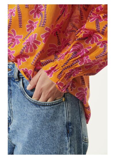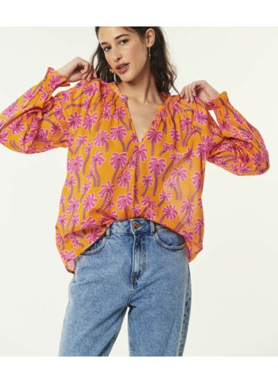 Un vestiaire printanier graphique et acidulé avec cette blouse en voile de coton. Animé de palmiers, détails smockés et poignets volantés dynamisent ce modèle exotic chic.