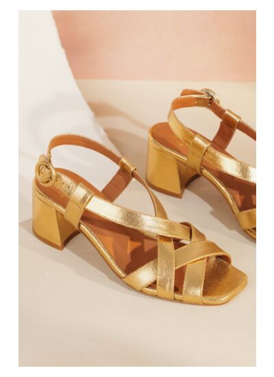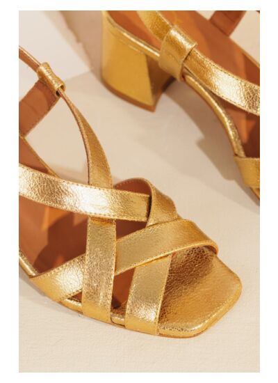Pour les grandes occasions, offrez-vous cette paire de sandales à talon en cuir doré. Bout ouvert et brides croisées pour un look rétro chic, ces chaussures à reporter avec un jean taille haute et un top coloré vous suivront toute la belle saison.