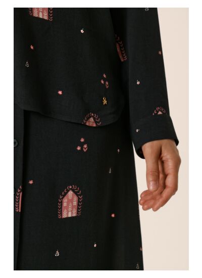 • Imprimé exclusif Des Petits Hauts "Kasba" d'inspiration folk représentant un motif tiny house dessiné sur un fond vert foncé