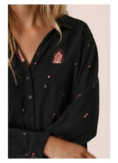 Romi, c'est la chemise que vous porterez dès l'entrée de saison avec un pantalon large en velours ou un jean. En crêpe de viscose douce et fluide, son motif graphique et coloré transporte dans un univers folk.