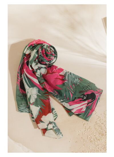 Chic et tropical, le motif foisonnant de ce paréo transporte dans un univers propice au farniente.