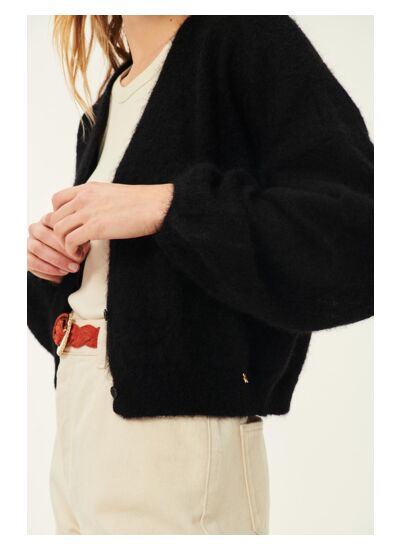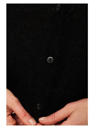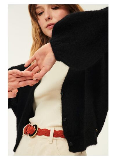 • Gilet noir réalisé avec un fil italien composé de Super Kid Mohair et de Baby Alpaga, tous deux provenant de fermes certifiées sans mulesing. Ce mélange de fibres lui confère un aspect duveteux et chaud.