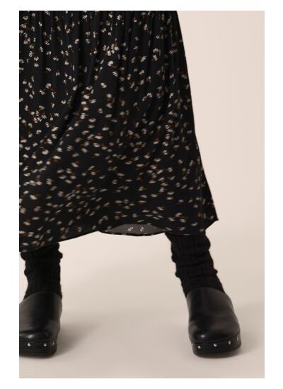 En viscose fluide et longueur midi, on aime le look rétro de la jupe Valana. Volantée en base et animée d'un motif floral poétique, elle laisse supposer que la saison sera chic et folk.