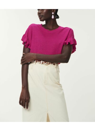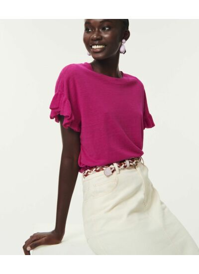 Un parfum estival souffle sur le vestiaire d'entrée de saison avec ce pull en lin. Manches courtes volantées et teinté d'un coloris ultra dynamisant, offrez-vous ce mocèle chic et graphique à porter avec une jupe longue ou un pantalon.