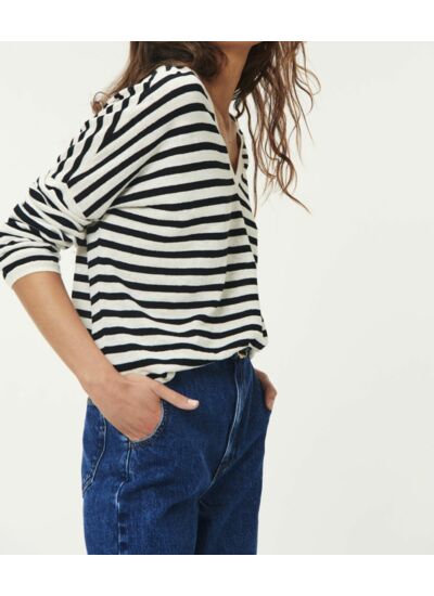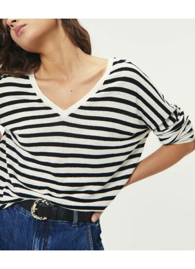 Esprit marinière avec ses rayures noires, le pull femme se porte col V et coupe légérement large pour le printemps. En lin doux et léger, jean taille haute ou pantalon large s'accorderont parfaitement à ce modèle qui vous accompagnera année après année.