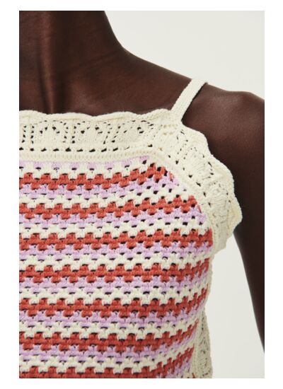 • Top réalisé en fil du groupe "Crochet" en coton biologique très serré, certifié OCS. Le tricotage donne un effet crochet avec différents points et ajourés. Cette maille sèche est confortable et souple.