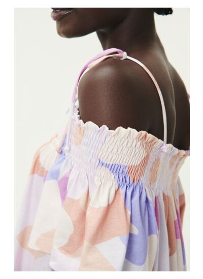 Légère et aérienne, la robe transporte dans un univers bohème et poétique. Parfaite pour une occasion chic décontractée et pour composer un look estival, encolure smockée et fines bretelles à nouer mettront en valeur vos épaules.