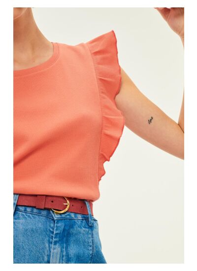 Le t-shirt femme dévoile tout son charme pour l'été. Alliant la simplicité d'une coupe à l'élégance bohème de découpes volantées pour structurer la silhouette, son coton côtelé doux et confortable ajoute un supplément de style au modèle.
