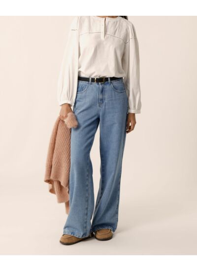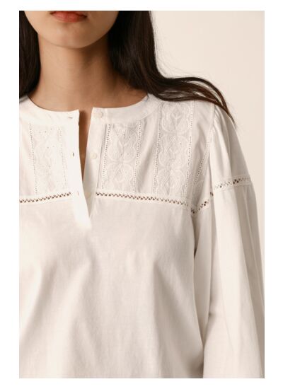 Cet automne, l'incontournable t-shirt oversize sort de sa zone minimaliste et se pare d'une découpe en dentelle pour l'occasion. Col rond, boutonné et joliment froncé, Iomelie s'accordera aussi bien à un pantalon habillé qu'à un jean.