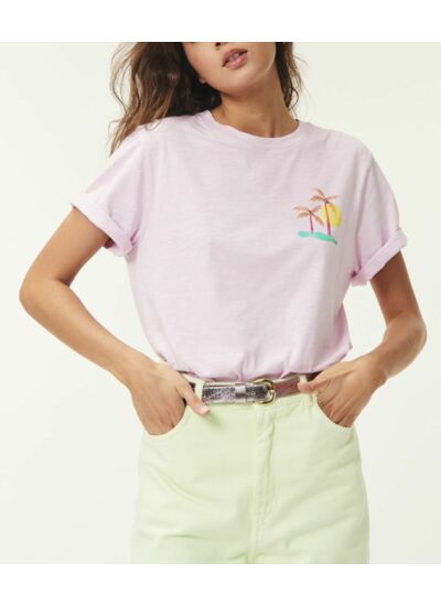 Confectionné dans notre emblématique coton flammé, le t-shirt femme est imprimé d'une sérigraphie à l'esprit rétro. Basique facile à coordonner, portez-le manches retroussées avec un gilet sans manches et un pantalon clair pour un look urbain.