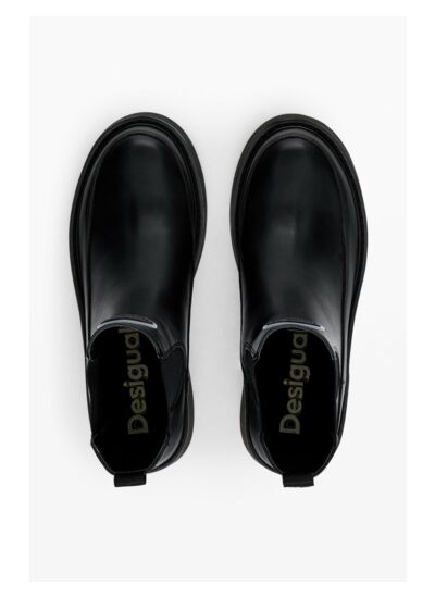 Bottine effet cuir avec tissus élastiques latéraux pour un ajustement précis. Surpiqûres décoratives sur les côtés. Semelle épaisse avec léger talon pour un équilibre parfait entre confort et élégance. Entretien : ne pas laver.