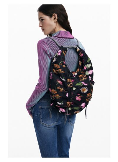 Dimensions et entretien : tissu plissé, cordons ajustables, convertible en sac à dos. Lavage en machine à froid à l’envers, cycle très délicat.