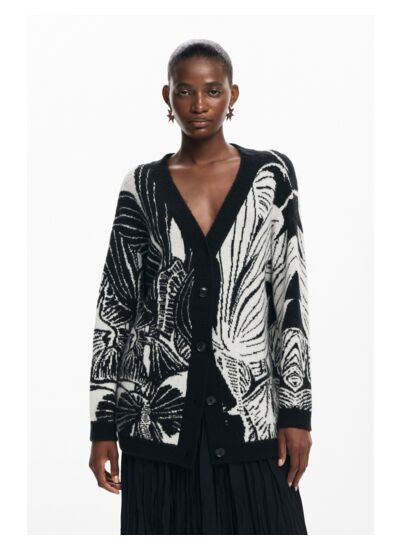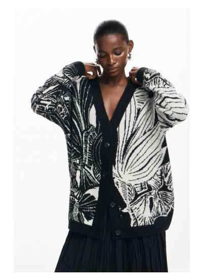Adoptez l’élégance décontractée avec ce cardigan en maille signé Desigual, alliant confort et style audacieux. Sa fermeture à bouton et son col en V imprimé apportent une touche graphique unique à votre silhouette.