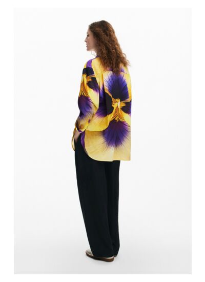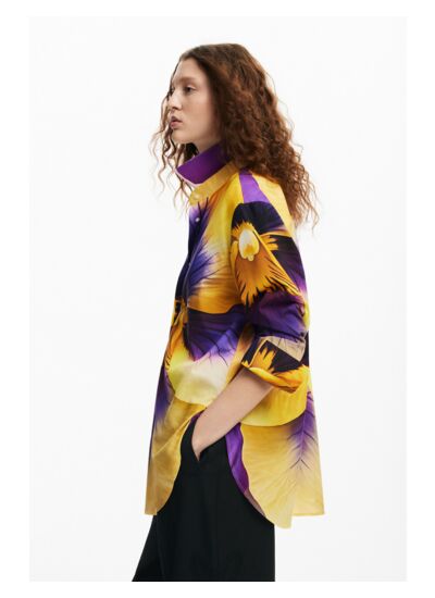 Lavage en machine à l’eau froide, cycle délicat. Chemise oversize à manches longues, fermeture boutonnée, imprimé fleur de lys signé Christian Lacroix, marque Desigual.