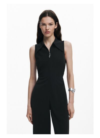 Adoptez l’élégance décontractée avec cette combinaison longue à coupe droite, sublimée par des fronces latérales qui sculptent la silhouette. Sa fermeture éclair frontale et son col de chemise en couleur unie apportent une touche moderne et raffinée à votre dressing.