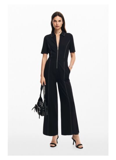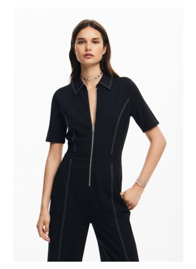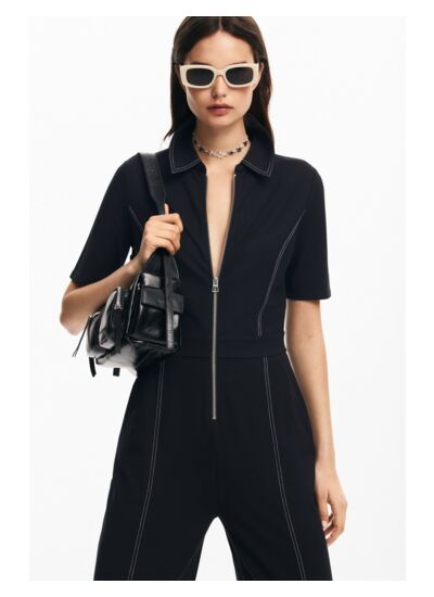 Conçue avec des manches courtes et un col chemise, cette combinaison joue sur les détails avec une fermeture éclair pratique et des surpiqûres contrastées qui apportent une touche graphique unique. Sa maille douce et légère épouse le corps tout en offrant une liberté de mouvement idéale, parfaite pour une journée active ou une soirée décontractée.