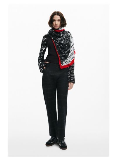 Affirmez votre style avec ce foulard à lettrage, une pièce qui allie audace et élégance. Sa silhouette rectangulaire s’adapte à toutes vos envies, du porté classique au drapé original.