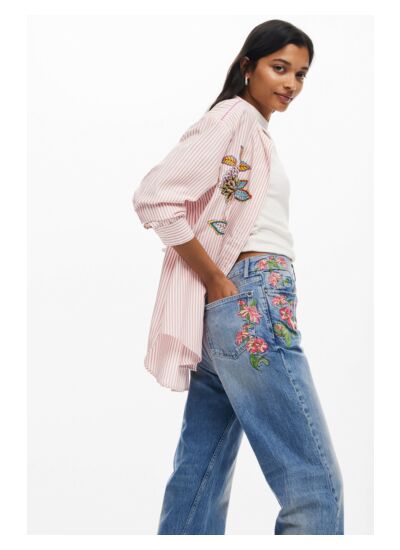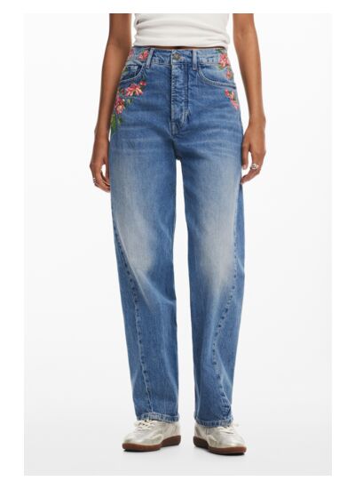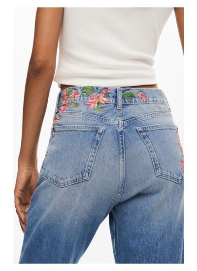 Adoptez un style audacieux avec ce jean long droit en denim usé, sublimé par de délicates fleurs brodées à la taille. Une pièce unique qui allie authenticité et féminité pour un look résolument moderne.