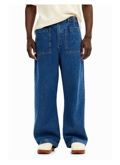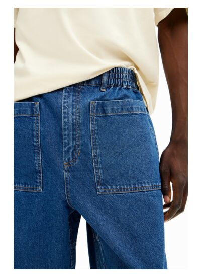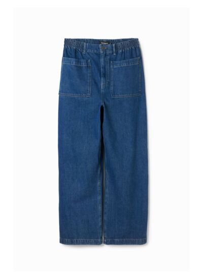 Lavage en machine à froid à l’envers recommandé pour préserver la couleur et la texture du denim. Coupe longue, fermeture à bouton et zip, taille élastique, grandes poches avant et arrière. Marque Desigual, catégorie Denim Long Trouser.