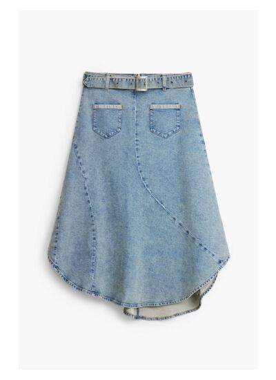 Matière : denim. Coupe asymétrique. Ceinture ajustable. Fermeture par bouton. Poches latérales. Lavage en machine à froid à l’envers recommandé pour préserver la couleur et la matière.