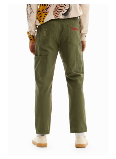 Lavage en machine à l’eau froide recommandé pour préserver la qualité des broderies et la tenue du tissu. Coupe droite, poches cargo latérales, broderies discrètes sur l’avant, coloris vert kaki.