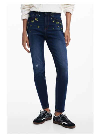 Confectionné dans un denim de qualité, ce pantalon épouse parfaitement la silhouette tout en offrant un confort optimal. Le détail floral apporte une touche de fraîcheur et de caractère, rehaussant la simplicité du modèle. Sa coupe longue et droite s’adapte à toutes les occasions, du casual chic au bureau.