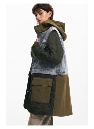 Lavage en machine à froid à l’envers, cycle délicat. Fermeture à boutons, col à capuche, tissu hybride denim, plusieurs poches fonctionnelles.