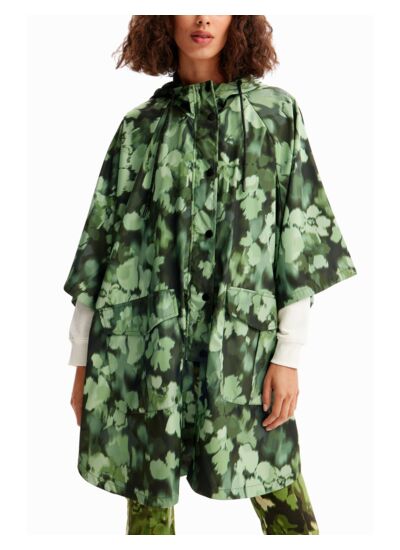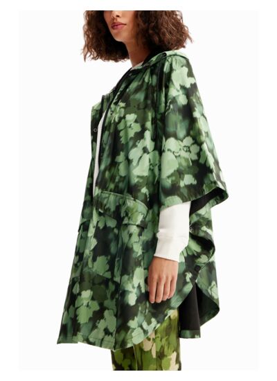 Imperméable léger en tissu technique, coupe poncho oversize avec capuche, grandes poches frontales, ouvertures sur les côtés pour une meilleure aération. Imprimé floral camouflage exclusif Desigual. Lavage doux en machine à l’envers, à froid, avec couleurs similaires.