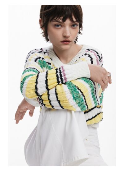 Fabriqué dans une maille fine (thin gauge), ce pull présente un col rond et des manches longues. Le lavage doit s’effectuer en machine à froid, cycle très délicat, et à l’envers pour préserver l’éclat des rayures et la texture de la maille. Marque : Desigual.