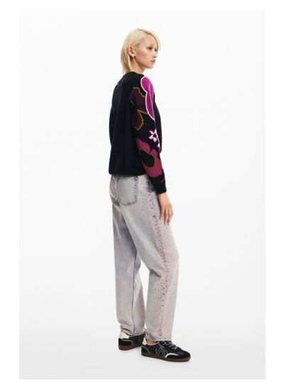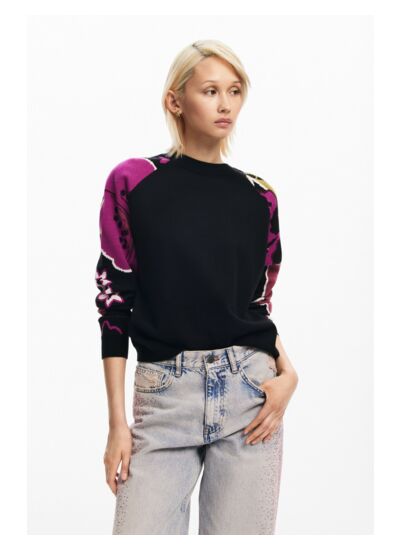 Fabriqué en maille fine, ce pull se lave à la main pour préserver la qualité des fibres et l’éclat des couleurs. Il présente des manches longues et un corps uni, avec un imprimé floral distinctif sur les manches, signature du style Desigual.