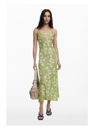 Laissez-vous séduire par l’élégance légère de cette robe longue style nuisette, sublimée par un imprimé floral mini délicat et un dos ouvert audacieux. Associez-la au pull cropped en crochet ton naturel pour un look estival raffiné et décontracté.