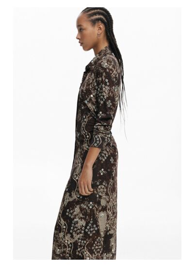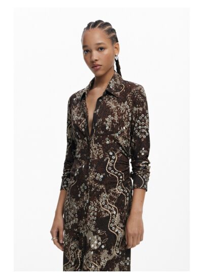 Conçue pour allier confort et style, cette robe Desigual se distingue par sa coupe fluide et ses manches longues qui apportent une touche de raffinement. Le tissu léger et la texture brillante captent la lumière, révélant un motif serpent subtil qui dynamise votre tenue, idéale pour une journée au bureau ou une soirée urbaine.