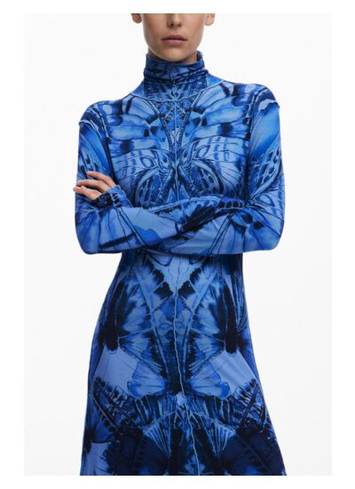 Réponse. Cette robe est conçue dans un tissu léger et confortable, typique des créations Desigual, assurant douceur et durabilité.
