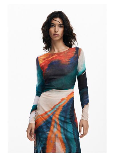 Affirmez votre style avec cette robe longue à manches longues signée Desigual, où l’imprimé coloré dynamise chaque mouvement. Une pièce unique qui transforme votre allure en une déclaration vibrante et élégante.