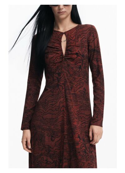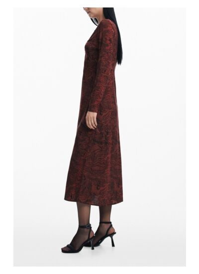Conçue pour accompagner vos journées comme vos soirées, cette robe joue sur un motif graphique unique qui dynamise votre silhouette. Sa longueur midi et ses manches longues offrent une allure sophistiquée tout en restant facile à porter, idéale pour celles qui recherchent une pièce versatile et distinctive. Le tissu fluide épouse délicatement le corps, garantissant une liberté de mouvement sans compromis sur le style.