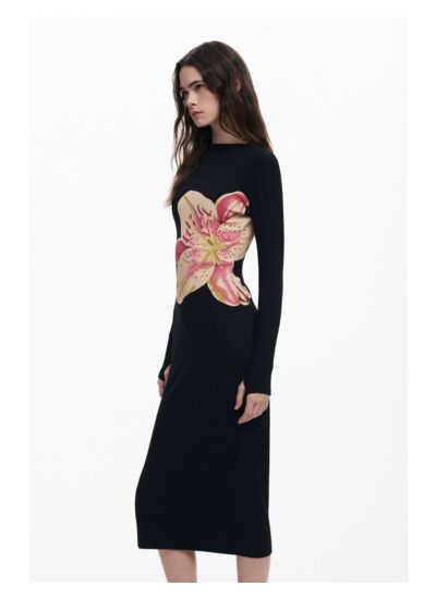 Conçue pour épouser vos formes, cette robe à manches longues allie confort et style grâce à son tissu côtelé extensible. L’imprimé grande orchidée apporte une touche florale distinctive qui dynamise votre tenue, idéale pour un look sophistiqué en journée comme en soirée. Son col montant souligne délicatement le cou, tandis que la coupe longue allonge la silhouette avec élégance.