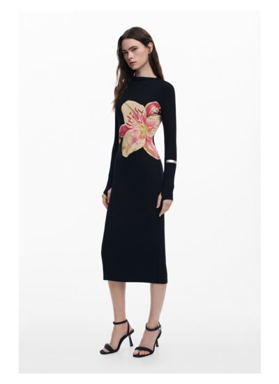 Affirmez votre élégance avec cette robe longue ajustée en tissu côtelé, sublimée par un imprimé orchidée audacieux. Une silhouette sculptante et un col montant pour une allure à la fois moderne et raffinée.