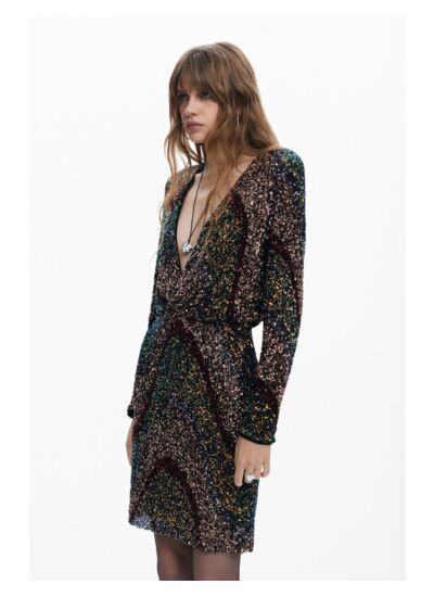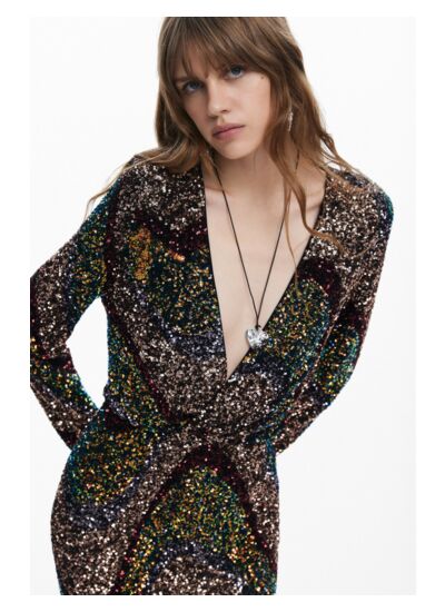 Entretien : lavage à la main recommandé pour préserver l’éclat des sequins et la qualité du tissu. Marque : Desigual. Catégorie : robe longue à manches longues.