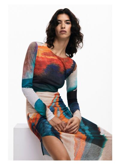 Affirmez votre style avec cette robe longue à manches longues signée Desigual, où l’imprimé coloré dynamise chaque mouvement. Une pièce unique qui transforme votre allure en une déclaration vibrante et élégante.