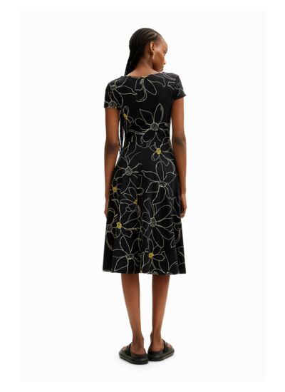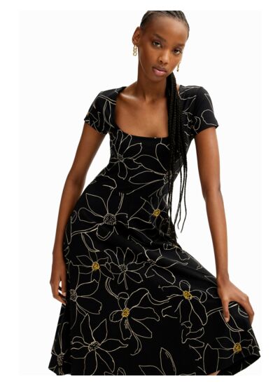 Robe courte manches courtes, coupe évasée, imprimé floral sur fond noir. Matière légère et respirante, idéale pour la saison printemps-été. Disponible dans plusieurs tailles selon la collection Femme SS24 Desigual.