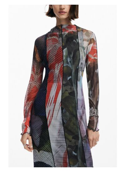 Conçue pour allier féminité et confort, cette robe Desigual joue sur la transparence légère du tulle et la richesse des motifs floraux pour une allure à la fois sophistiquée et moderne. Sa coupe ajustée souligne la taille tout en offrant une liberté de mouvement idéale, que ce soit pour une soirée ou une journée chic.