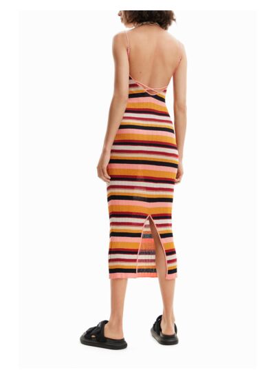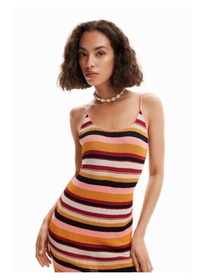 Maille côtelée stretch à rayures, coupe midi ajustée, bretelles fines avec détail croisé dans le dos. Composition et entretien disponibles sur l’étiquette du produit.