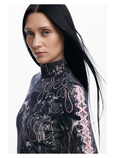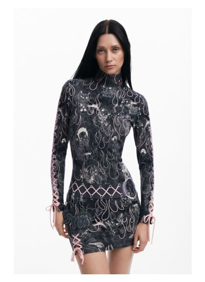 Affirmez votre style avec cette robe mini slim à col montant, signée María Escoté, où l’audace rencontre l’élégance urbaine. Son effet usé et ses détails de nœuds apportent une touche unique et contemporaine à votre silhouette.