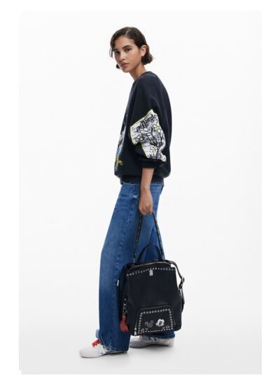 Dimensions adaptées pour un usage quotidien, effet cuir de qualité, broderies précises et détails en clous résistants. Porte-clés amovible pour personnaliser votre sac. Lavage en machine à froid à l’envers, cycle très délicat recommandé pour préserver les finitions.